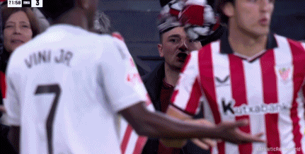 第74分钟,慢镜头给到维尼修斯伸出三个手指回应对方球迷
